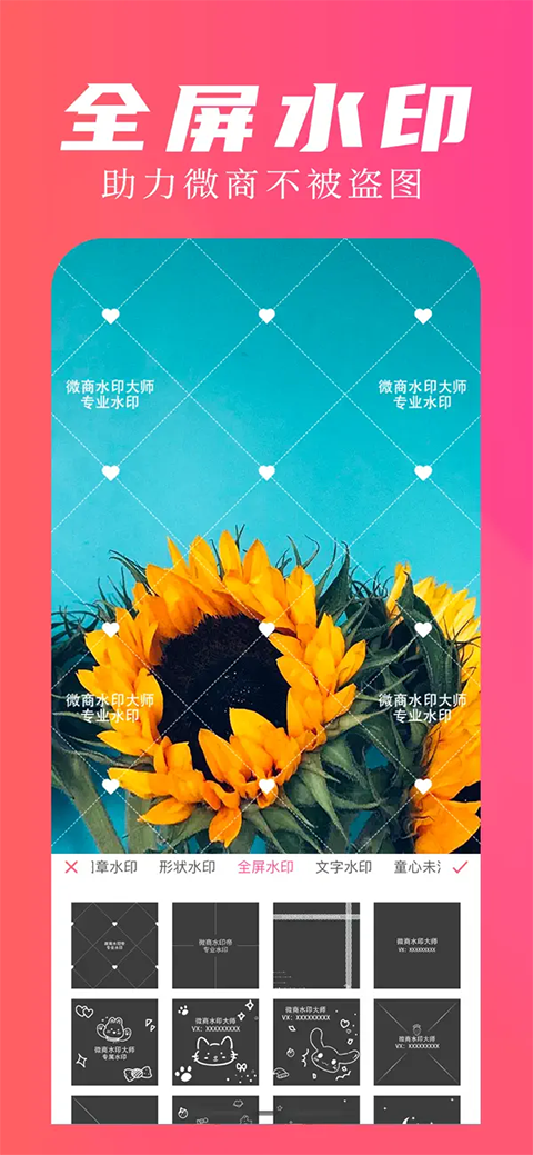 微商水印大师是一站式图片水印添加、海量朋友圈背景图制作工具,用户可以利用它免费制作出属于自己的水印和二维码,在手机上你就可以给你的图片打上水印,不仅如此微商水印大师还具有标签、贴纸、画笔、马赛克等功能,帮助微商们可以更加快速的推销产品。强大的图片处理功能,使用更加简单方便。除此之外,微商水印大师ios版用户可以上传自己的图标,再加以修改图片的各种各样的属性,让它成为用户自己的独一的图标,对于喜欢展现个性化的朋友来说,绝对是一款不可或缺的app。