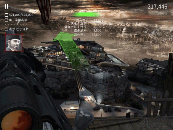之后上面会有个警卫也透过玻璃去看那辆车。打玻璃打警卫为就会砸中另一个人,就可以完成连锁击杀。