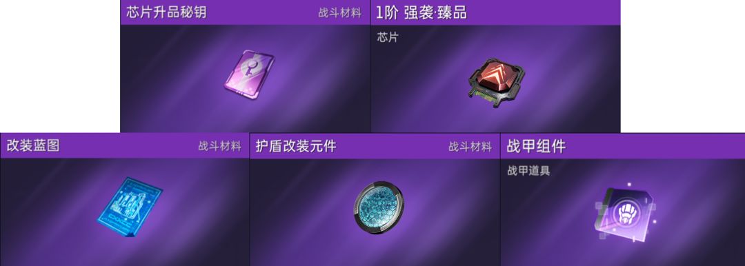 芯片升品秘钥、紫色芯片、改装蓝图、护盾改装元件、战甲组件等;