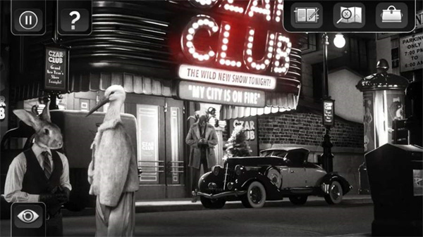 公鸡神探手机版是一款黑白画风的剧情丰富类冒险解谜游戏,它让人回想起40年代黑色电影的情节和氛围。游戏将经典冒险游戏的主要元素与视觉小说的叙事风格完美结合,在游戏中桑尼·费瑟兰和马蒂·麦肯基曾经是搭档,他们造就了警探二人组“公鸡神探”的传奇。不过,时过境迁,他俩也快被时间给遗忘了。如今,桑尼被警队勒令休了带薪长假,整日依靠酒精来打发时间;而马蒂则仍舍不得放下昔日明星探员的风光。他们最近一次搭档办案出了岔子,差点丢了性命,从此他们一拍两散,再没说过一句话……不过现在又因为一个离奇的案件,桑尼和马蒂不得不再度联手,而这个案子也是有史以来最让他们摸不着头脑的一件!游戏中有30多个可以与之交谈的角色,你必须仔仔细细地审问其中一些角色,从而收集大量的线索和证据,并找出利爪市各个阴暗角色极为敏感的个人信息,好加以利用来对付他们!