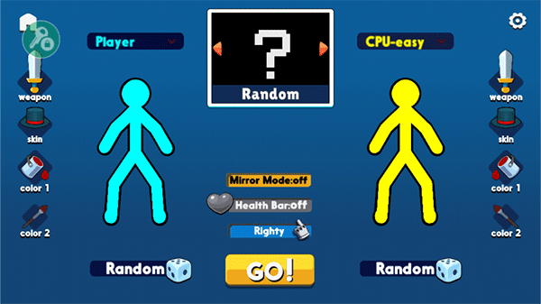 2、选择好模式和人数后,进入对局准备界面,在这玩家可以给火柴人换装备,以及皮肤等等,准备好后点击GO就能进入游戏