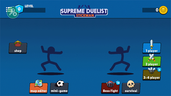 火柴人至高对决(Supreme Duelist Stickman)是一款有趣又疯狂的火柴人手机游戏,又被叫做火柴人至尊对决。游戏采用卡通设计风格,动作场景具有趣味,还有着独特的玩法模式,能够给玩家不一样的火柴人游戏体验。火柴人至高对决游戏内置三种游戏模式,单人模式,和人机斗智斗勇,双人对战,可以和朋友一起玩耍,幸存模式,则是打僵尸一样的敌人,考验生存实力。在单人模式里,玩家还可以选择人机的等级,Lv1-Lv9,人机的等级越高,难度越高,还有多种地图供玩家选择,感兴趣的小伙伴快来下载游玩体验吧!