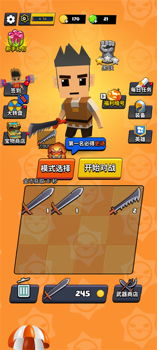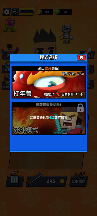 1、进入我这一刀下去官方正版游戏后先进行【模式选择】,目前提供【打年兽】与【死斗】两种玩法,其中【死斗模式】需武器等级达到6级后解锁。