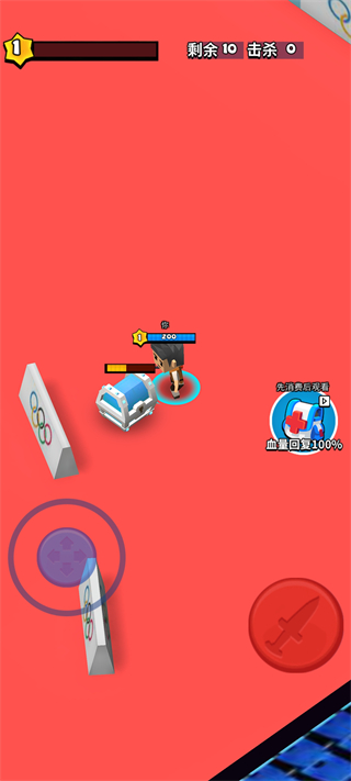 4、进入对战地图后,玩家可拾取场景中的宝箱获取资源,右侧红色刀形按钮为攻击键,用于释放普通攻击。