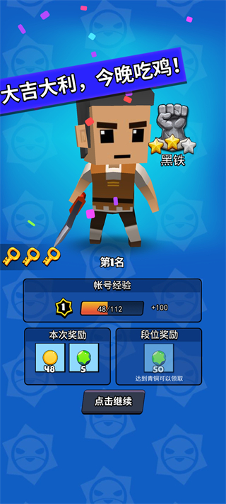 7、取得胜利后将显示【大吉大利,今晚吃鸡】结算界面,可领取账号经验、金币等奖励,用于后续成长与强化。