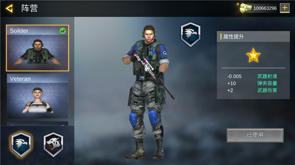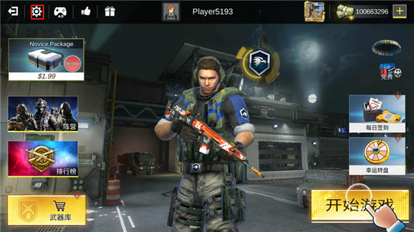 1、打开在本站下载的打击力量英雄,进入首页我们可以看到有阵营、排行榜、武器库等等功能板块,我们可以先点击齿轮状的设置键