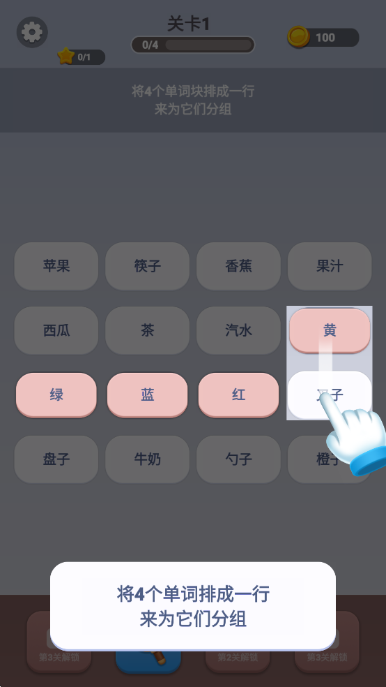 2、将4个单词排成一行来为它们分组