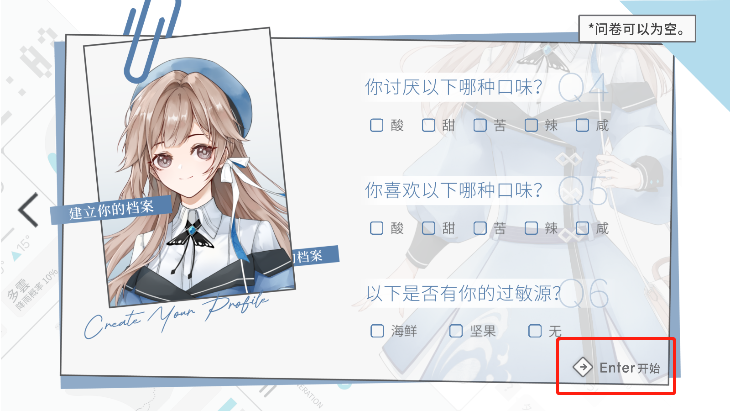 5、接下来会出现6道简单的问卷题,当然也可以选择不填,直接点击右下角的Enter开始;