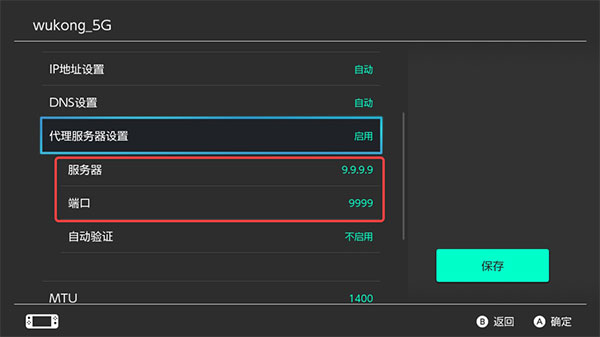3、将“代理服务器设置”切换为“启用”状态,并依照加速器中的网络设置页面的提示信息,将“服务器”、“端口”信息进行设置