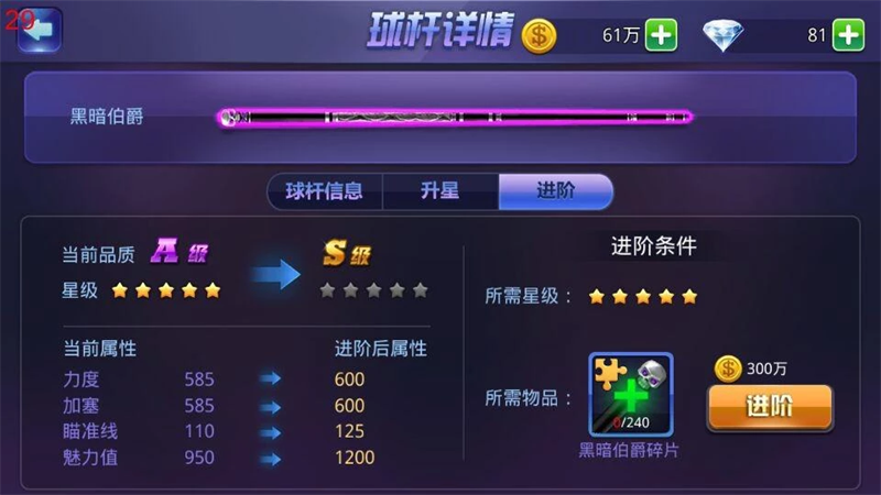 球杆达到5星后,就可进阶了。每次进阶可提升球杆一个等级,按顺序是C