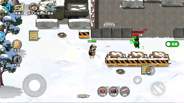 在雪地场景遭遇敌人时,可利用掩体卡视角,瞄准敌人弱点射击,同时关注自身血量,必要时使用药品回复。