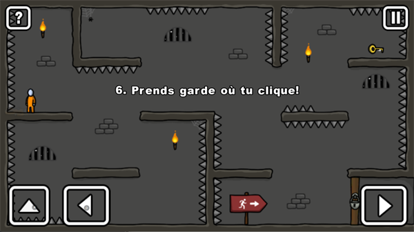 第6关「Prendsgardeoùtuclique!」属于典型的陷阱关卡,玩家需要谨慎点击屏幕,避免误触隐藏机关或致命陷阱。游戏中的每一关都拥有独特的规则与挑战,考验玩家的观察力与判断力。