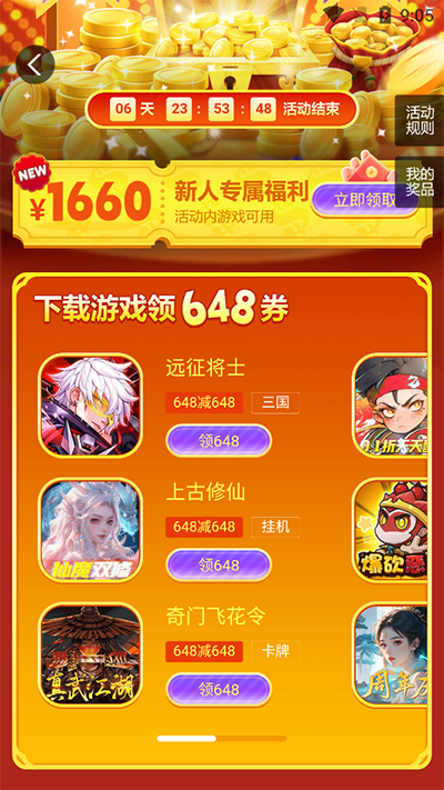3387游戏盒官方版是一款0.1折游戏软件,里面汇聚了海量高福利的0.1折精品手游,新用户注册进入即可免费领取648优惠券,还有海量无门槛礼包免费领取。客服提供24在线服务,任何游戏问题,充值问题都能及时得到解决。3387游戏还会有每天更新新的游戏资源,海量游戏资源保证你怎么玩也玩不腻。心动的朋友快来当快软件下载吧!