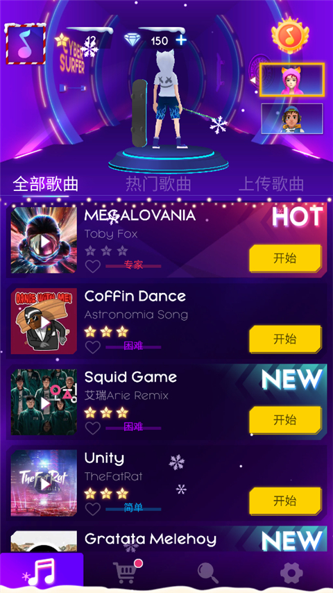 7、返回主页面,挑选“全部歌曲”“热门歌曲”或“上传歌曲”,自由选择你最爱的旋律开始挑战;