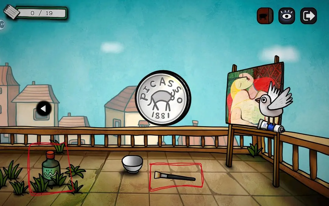 小鸟抓走蓝颜料,进入屋顶,捡起画笔和杀虫剂,小鸟还抓着蓝颜料,在之后触发