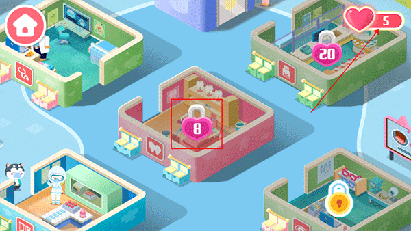 6、成功帮忙完毕后,可以得到爱心,可以用来解锁新的科室,在游戏上方可以看到拥有的爱心数量。