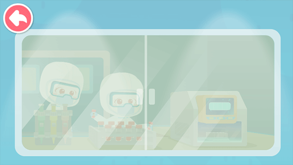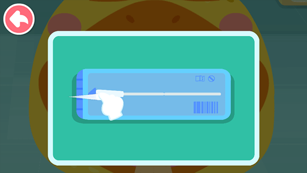 看,小白兔在药房门口等待。吃药会帮助身体更快恢复,宝宝快来帮忙取药。让小白兔出示就诊卡,将就诊卡插入读卡器中,查看她需要哪些药物:棉签、创口贴和绿药丸。
