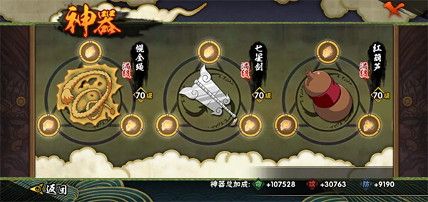 各位学员每当使用忍玉将一个神器强化至70级时,另一个神器便会解锁。如下图所示: