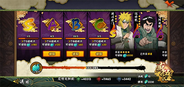 在收集忍者碎片的过程中,忍传系统也可以帮我们提升战力。如下图所示: