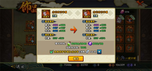 而且在游戏中,饰品与忍具的强化成功对于战力提升尤为重要。以饰品为例,在强化时,除了消耗秘术之尘、秘术之星这些固定的道具外,还会消耗保护符,以提升强化成功率。如下图所示: