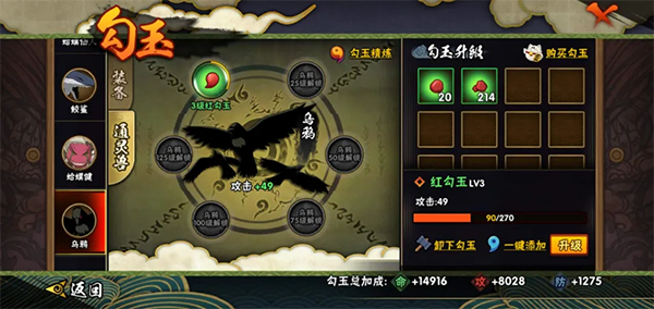此外还可消耗精炼石与铜币进行精炼,提升勾玉对应属性,以提升战力。