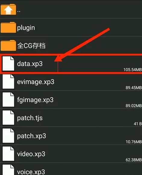 4、打开对应的游戏文件夹后,会看到游戏名称及相关文件,选择【data.xp3】文件。