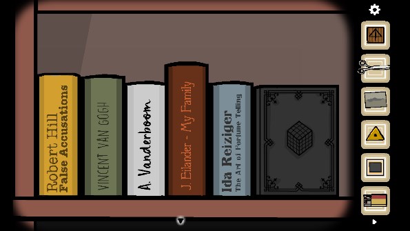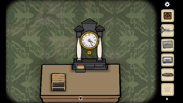 13、点击两次钥匙孔后出现眼睛,观察眼睛上的图案位置,转动时钟的指针至十二点四十五,打开暗格后获得「三角形钥匙」,用钥匙打开右边的抽屉获得「胶片2」和「手帕」,打开左边的抽屉是各种文件夹,里面有书架上摆放书位置的提示和一个「文件」