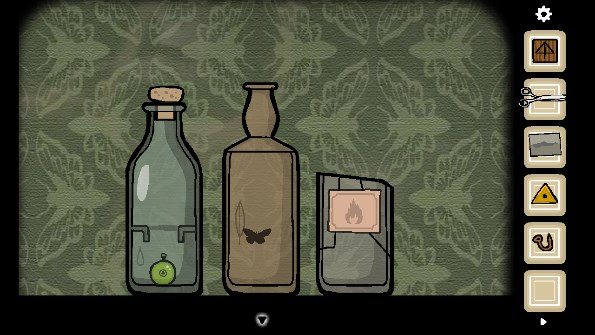 18、点击毛毛虫吃掉叶子化成飞蛾后,来到沙发处,用剪刀剪开沙发获得「线」,拿走杯子,将文件柜上瓶子里的液体用杯子装上,将液体倒入第一个瓶中,将线绑在瓶塞上,再放上钩子后获得「绿色眼球」