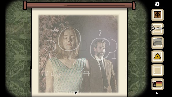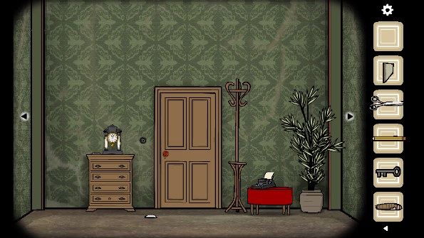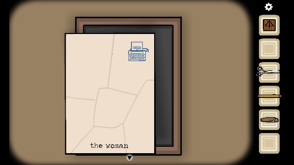 5、将五个碎片全部放在相框上获得提示「the woman」(中间有一个空格),点击打字机输入英文后出现一张纸,用铅笔涂抹纸上出现的男人、门、女人等,最后涂抹钥匙图案获得「钥匙」
