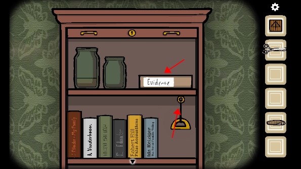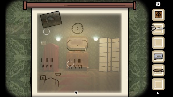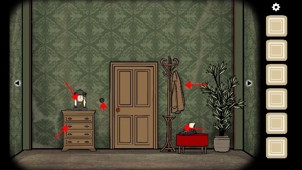 1、拿走衣架上的「大衣」,打开旁边的三层抽屉,拿走里面的「剪刀」、「照片碎片」和「铅笔」,打开门旁边的开关,来到右边拿走灯罩里的「照片碎片」