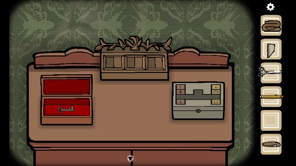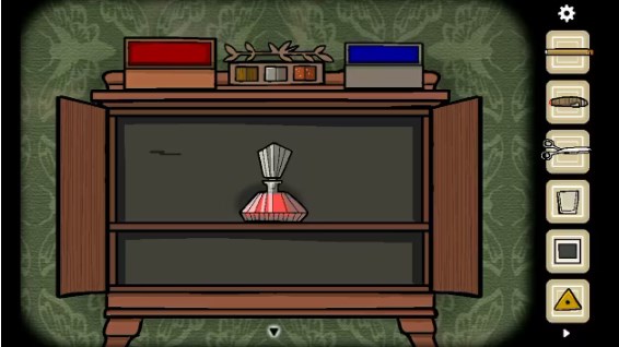 3、打开左边的盒子获得「钥匙」,移动旁边盒子上的方块到正确的位置,打开盒子后获得「照片碎片」,点击镜子穿上大衣,出现女人后来到门口