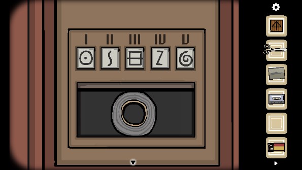 7、来到对面,用拉手拉下投影幕,按照投影幕的标记对应位置后获得两个数字「Ⅴ、Ⅳ」,其对应的符号为「X、·」,拿走投影幕上的「照片」