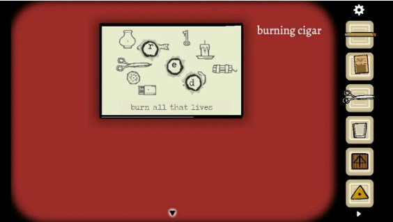 27、在打字机上输入burn后出现传单,用剪刀从中间剪开,再将两张纸重叠,根据纸上的提示「燃尽一切可燃之物」用雪茄将纸上可以被点燃的东西烧出洞,获得提示「life」