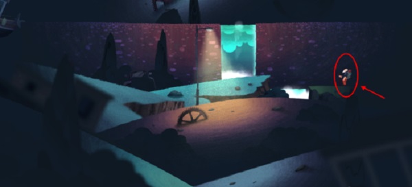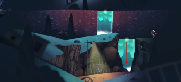 3、走一段时间后会遇到比较宽的道路,按住不松一直往下拖,就可以看到新路了。新的场景中我们可以看到瀑布(海底也有瀑布),从这里跳下去。