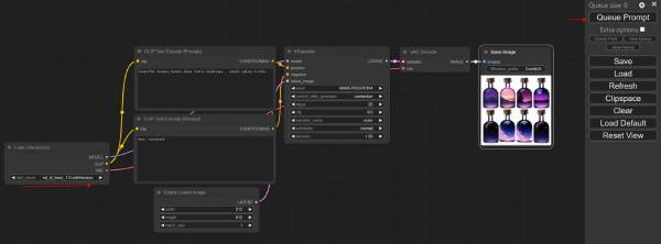 参数设置完成后,点击右上角的“Queue Prompt”按钮,启动生成任务;执行过程中,节点会呈现高亮状态,可通过高亮情况了解当前执行进度;生成完成后,底部输出面板会显示生成的图像,点击图像即可直接下载,也可拖拽图像到工作区,用于后续二次编辑或复用。